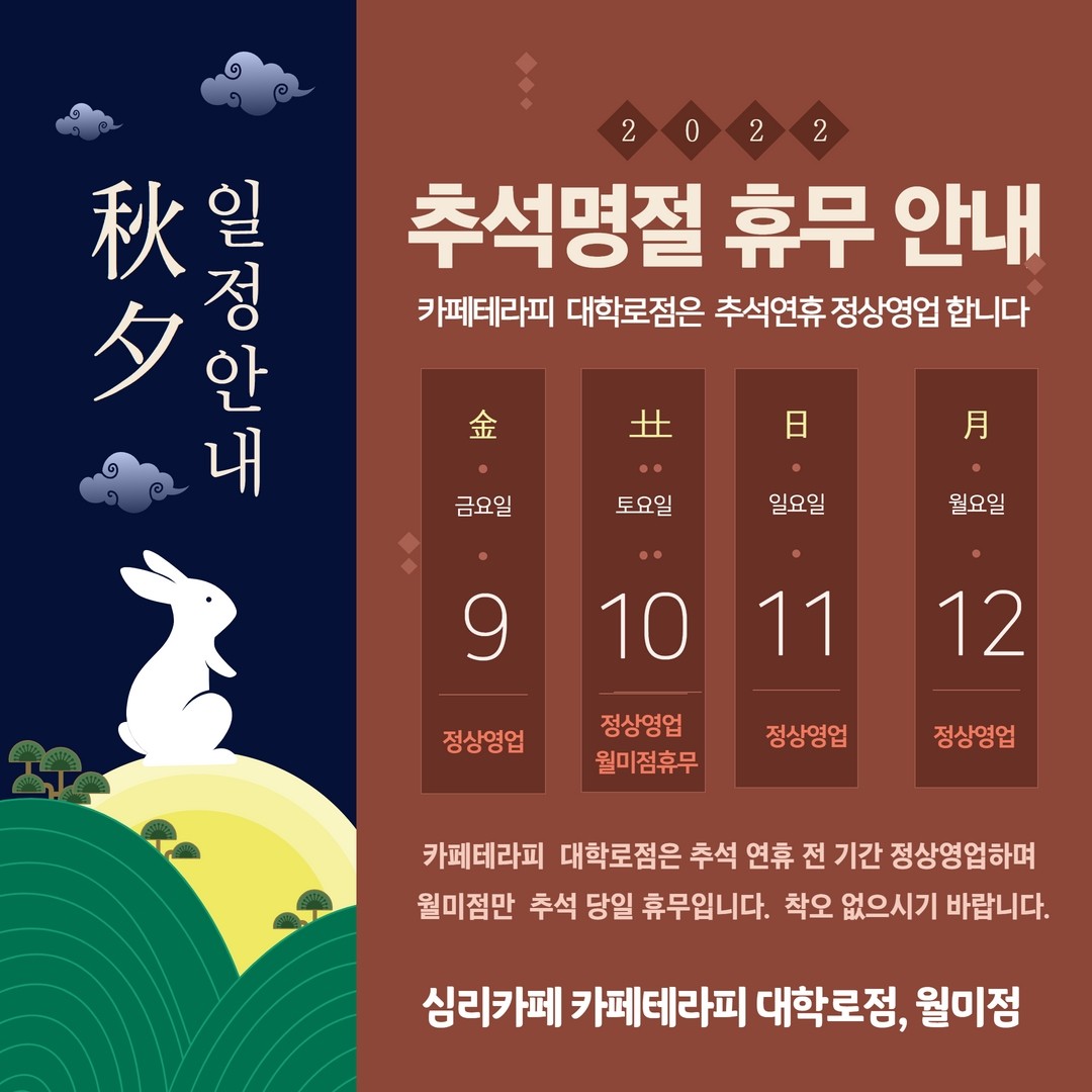 추석연휴 대학로점은 모든 연휴기간 동안 정상영업 월미점은 추석 당일만 휴무입니다.